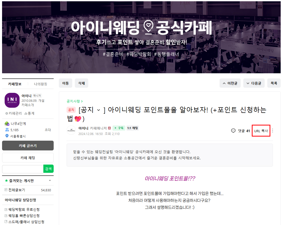 카페 글을 작성하신 후에 자동적립되는 형식이 아닌 https://point.iniwedding.com/ 포인트 사이트에